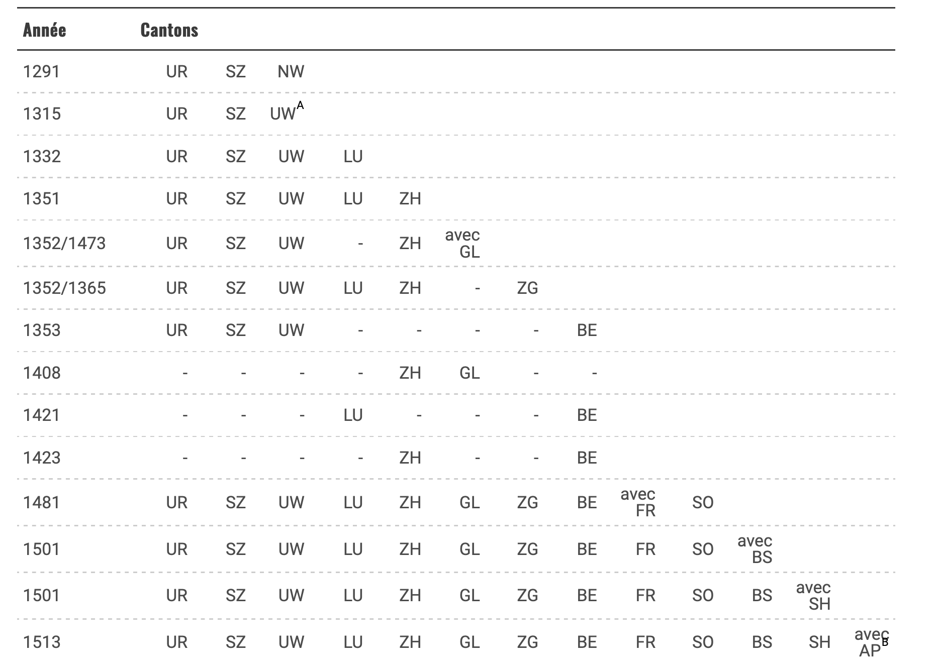 Voyez ce tableau indiquant l’entrée et la sortie régulières de cantons dans ladite Confédération. Processus inexorable ? Bien-sûr que non. Processus incrémental, sans aucun doute.
