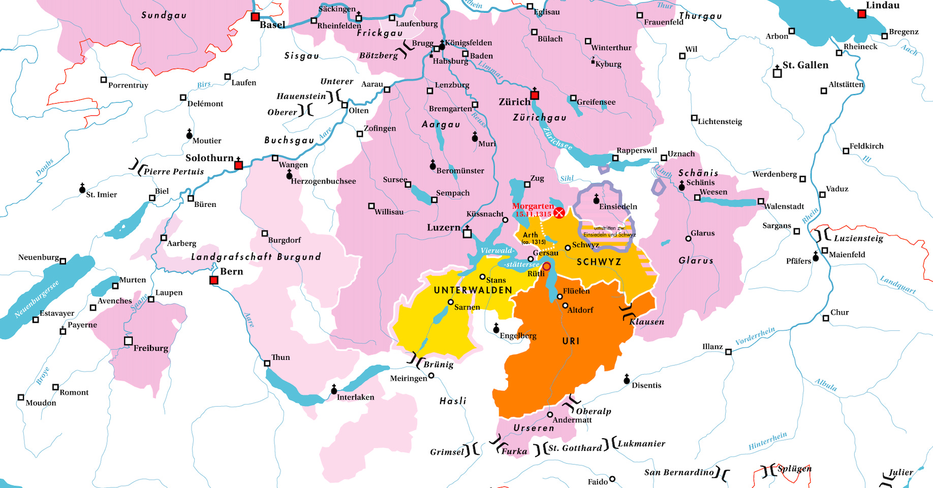 Et là, on le remarque, le rose tend à encercler trois territoires couleurs d’agrume. Qui sont-ils ? Et pourquoi, au centre de la carte, ce lieu écrit en rouge et appelé “Morgarten” ? Pourquoi cette date du 15 novembre 1315 ?