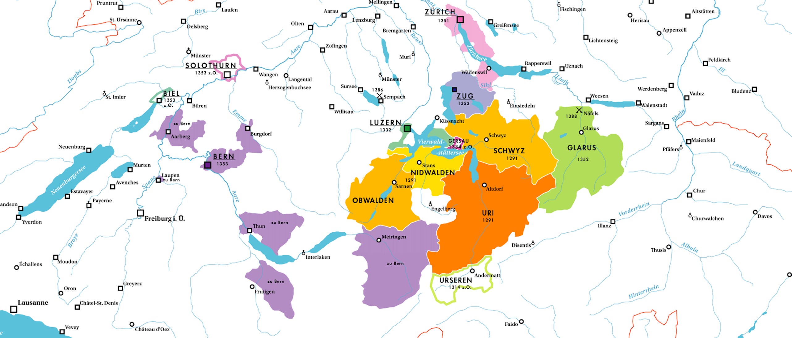 Concrètement, la tentation hégémonique des Habsbourg provoque l’alliance défensive de trois “Etats forestiers” : les Waldstätten d’Uri, Schwytz et Unterwald. Une des “lignes de front” se situent sur les droits d’usage de l’eau et des alpages (Le XXIe siècle des méga-bassines et des retenues collinaires n’a rien inventé).