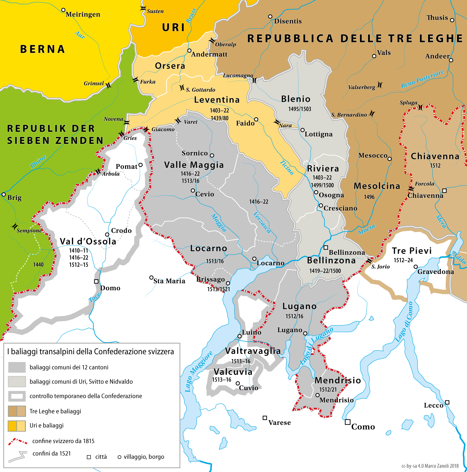 Les conquêtes communes devinrent des bailliages communs (Blenio, Riviera et Bellinzona). Parvenus au pied des Alpes lombardes, les trois cantons n’étaient plus qu’à 100km de Milan.