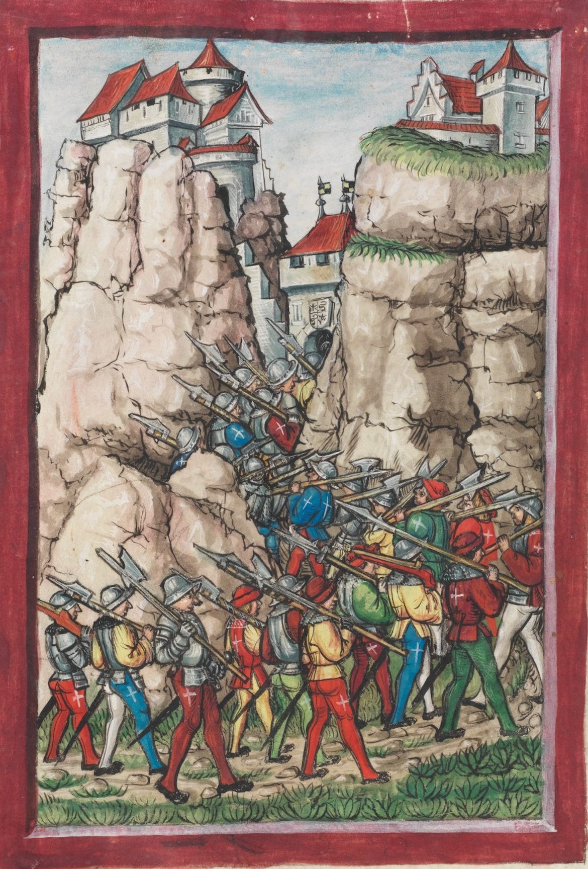 7/8. De part et d’autre des cols des Alpes centrales, les cantons suisses immitèrent la Savoie et le Tyrol. Depuis leurs propres versants, ils partirent à l’assaut du versant sud, celui détenue par le duc de Milan.