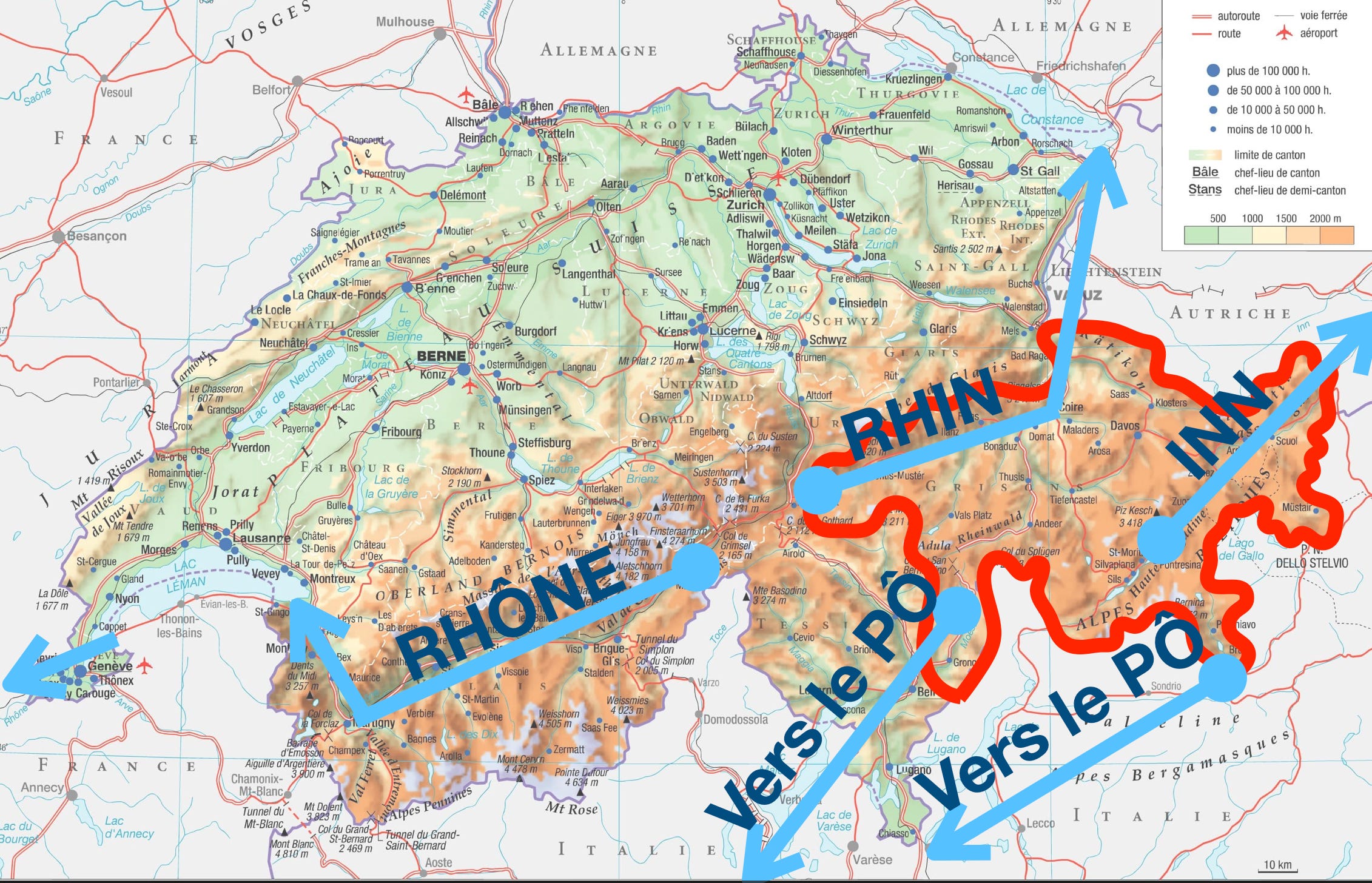 - Notez enfin que le Rhône n’appartient pas aux eaux grisonnes (il est de l’autre côté du massif du Gothard). Après avoir pris sa source en Valais, le Rhône se jette dans le Léman puis reprend son cours vers la mer Méditerranée.