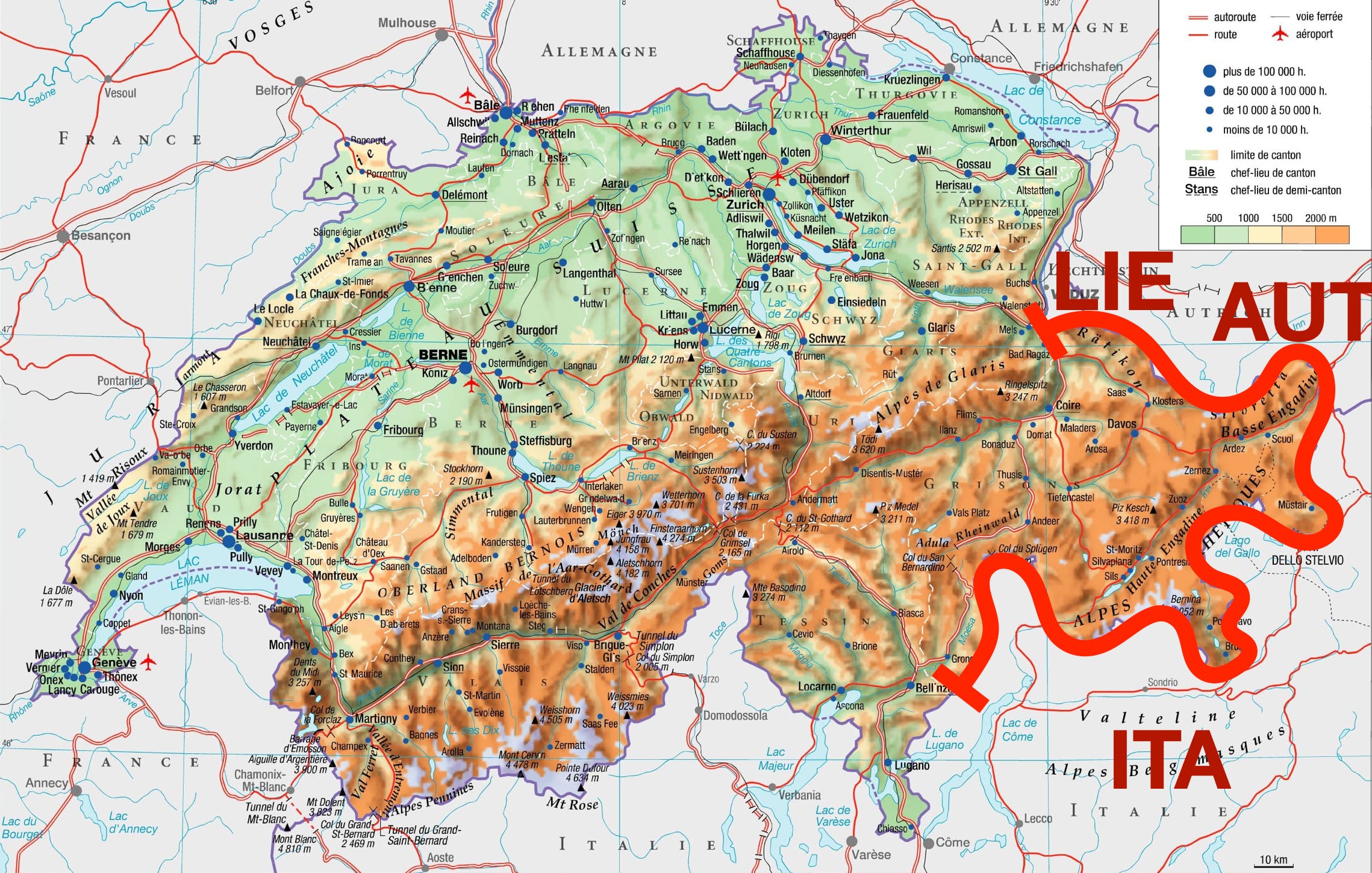 Avec les Grisons, la frontière italo-suisse est souvent reportée de l’autre côté des cols alpins, vers le sud, au commencement de la plaine du Pô. Ce sont les petites “pattes” italophones qu’on distingue au sud du canton (Moesano, Bregaglia et Poschiavo).