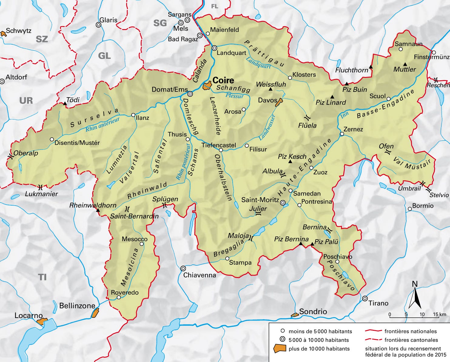 10/12. La faible densité de la population grisonne se retrouve dans sa hiérarchie urbaine. Sa capitale, Coire/Chur, compte… 41 000 habitants. Deuxième ville alpine de Suisse (après Lucerne, 83 000 habitants et devant Sion, 35 000), Coire pèse peu dans la trame urbaine de l’Arc alpin.