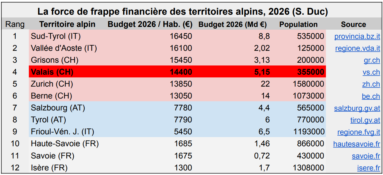 3/13. Le Valais du XXIᵉ siècle n’est plus une périphérie en quête de reconnaissance, mais une puissance régionale dotée d’un levier d’action hors norme. Avec un budget 2026 de 4,7 milliards CHF (5,15 milliards d’euros), le canton surclasse la quasi-totalité des territoires alpins.