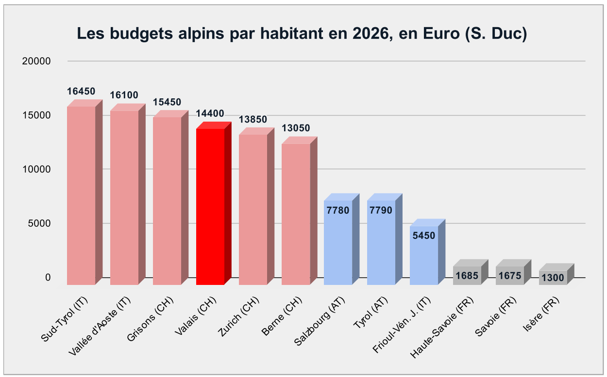 Le budget par habitant (13’250 CHF) dépasse le référentiel zurichois et s’avère huit fois supérieur à celui de départements français comme la Savoie (pourtant riche à l’échelle française). Ce différentiel massif, même corrigé du pouvoir d’achat et du coût des infrastructures de montagne, confirme notre sentiment de longue date : l’autonomie financière est la clé-de-voûte pour les territoires alpins.