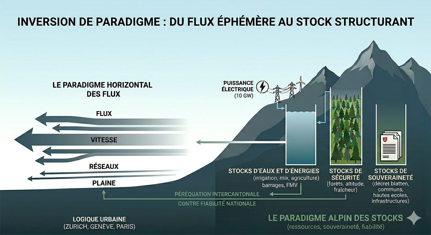 Or, la péréquation n’est pas un acte charitable : c’est la juste redevance versée par les métropoles à un territoire qui maintient, largement à ses frais, les stocks critiques de la nation : l’eau, l’énergie, la fraîcheur et une ingénierie territoriale en trois dimensions.